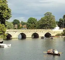 During Stratford's early expansion into a town, the only access across the River Avon into and out of the town was over a wooden bridge, which was first mentioned in 1235.[11] The bridge could not be crossed at times due to the river rising and was described by antiquarian John Leland as "a poor bridge of timber and no causeway to it, whereby many poor folks and other refused to come to Stratford when the Avon was up, or coming thither stood in jeopardy of life." In 1484, a new masonry arch bridge was built to replace it called Clopton Bridge, named after Hugh Clopton who paid for its construction, a wealthy local man who later became the Lord Mayor of London. The new bridge made it easier for people to trade within Stratford and for passing travellers to stay in the town.[11][25][26]