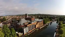 Victorian Stratford's growth as a tourist destination was further enhanced by Edward Fordham Flower and his son Charles Edward Flower, owners of a local brewery business, and important figures in local affairs: Through their campaigning and fundraising efforts, the Shakespeare Memorial Theatre was opened on the banks of the Avon in 1879.[12] The original theatre was destroyed by fire in 1926. Its replacement was opened in 1932, designed by Elisabeth Scott, making it the first important building by a woman architect erected in Britain.[40]