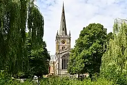 The settlement which later became known as Stratford was first inhabited by Anglo-Saxons following their 7th-century invasion of what would become known as Warwickshire, but was then part of the Kingdom of Mercia.[8][17] It is likely that an Anglo-Saxon monastery existed at the site of what is now Holy Trinity Church, which was founded after the land was acquired by Egwin, the third Bishop of Worcester (693–714).[18] The monastery was likely destroyed by Viking invaders in 1015.[19] The land remained in the ownership of the Bishops of Worcester until the 16th century.[20] The area around Holy Trinity Church is still known as Old Town as it was the original area of settlement around the monastery. The focus of the settlement at Stratford was later moved north, closer to the river crossing, which was better positioned for trade.[11]