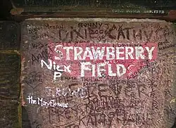 Strawberry Field became a popular visiting place for fans of Lennon and the Beatles as a result of the song.[202][203] In 1975, the Liverpool Public Relations Office published a tourism media package titled Nothing to Get Hung About, which contained Beatles-related postcards and history, and a map of Liverpool.[204] By 2011, the level of graffiti left by visitors at Strawberry Field had forced the Salvation Army to have the entrance gates removed[202] and later relocated to the Beatles Experience centre in Liverpool.[205][nb 16] In July 2017, the Salvation Army began raising funds – through the sale of T-shirts and mugs emblazoned with "Nothing is real" and other lines from Lennon's lyrics – to help finance the construction of a new building at Strawberry Field. The purpose of the building is to help provide job opportunities for young adults with learning difficulties, and to commemorate Lennon, in both an indoor exhibition and a "garden of spiritual reflection".[205]