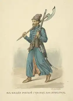 The first units were established by Ivan the Terrible as part of the first Russian standing army.[1] The streltsy were under the administration of the Streletsky prikaz from 1571.[2] Peter the Great curtailed the influence of the streltsy, and following the streltsy uprising of 1698, streltsy units began to be disbanded. However, it was not until the 1720s that this process was completed.