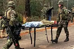 A flexible stretcher, also known by the brand names Reeves sleeve or SKED,[note 1] is a stretcher that is often supported longitudinally by wooden or plastic planks. Essentially a tarpaulin with handles, it is primarily used to move a patient through confined spaces, e.g., a narrow hallway, or to lift obese patients.[14] Reeves stretchers have six handholds, allowing multiple rescuers to assist extrication.[15]