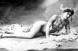 In 1905, the notorious Dutch dancer Mata Hari, later shot as a spy by the French authorities during World War I, was an overnight success from the debut of her act at the Musée Guimet.[21] The most celebrated segment of her act was her progressive shedding of clothing until she wore just a jeweled bra and some ornaments over her arms and head but exposing her pubic region.[22] Another landmark performance was the appearance at the Moulin Rouge in 1907 of an actress called Germaine Aymos, who entered dressed only in three very small shells. In the 1920s and 1930s, Josephine Baker danced topless in the danse sauvage at the Folies, and other such performances were provided at the Tabarin. These shows were notable for their sophisticated choreography and often featuring the women in glitzy sequins and feathers. In his 1957 book Mythologies, semiotician Roland Barthes interpreted this Parisian striptease as a "mystifying spectacle", a "reassuring ritual" where "evil is advertised the better to impede and exorcise it".[23] By the 1960s "fully nude" shows were provided at such places as Le Crazy Horse Saloon.[24]