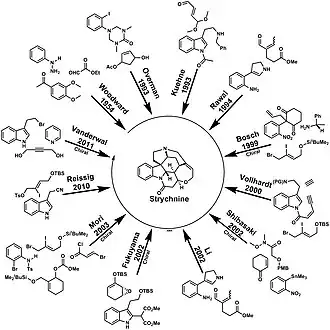 - ^ a b c Bonjoch J, Solé D (September 2000). "Synthesis of Strychnine". Chemical Reviews. 100 (9): 3455–3482. doi:10.1021/cr9902547. PMID 11777429. S2CID 30921537.