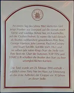 Plaque commemorating The Beatles' visit to Hamburg.