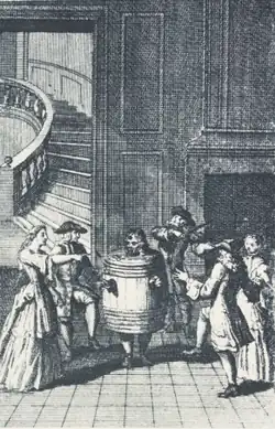 Refinement meets burlesque in Restoration comedy. In this scene from George Etherege's Love in a Tub, musicians and well-bred ladies surround a man who is wearing a tub because he has lost his trousers.