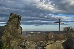 The core area of Stuttgart lies in a fertile bowl-shaped valley about 900 ft (270 m) above sea level,[127][h] an hour from the Black Forest and Swabian Jura[26] on the banks of the Neckar river at 48°47′N 9°11′E / 48.783°N 9.183°E 115 mi (185 km) to the west and north of Munich.[128] The city is often described as being "zwischen Wald und Reben" ("between forest and vines") because of its viticulture and surrounding forests. Stuttgart covers an area of 207.35 km2 (80 sq mi) and sits at elevation ranging from 207 m (679 ft) above sea level by the Neckar river to 549 m (1,801 ft) on Bernhartshöhe hill – something rather unique in large German cities. The most prominent elevated locales in Stuttgart are the Birkenkopf (511 m (1,677 ft)) on the edge of the Stuttgart basin, the Württemberg (411 m (1,348 ft)) rising above the Neckar valley, and the Grüner Heiner (395 m (1,296 ft)) at the northeast end of the city.
