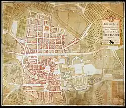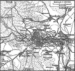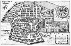 The Thirty Years' War devastated the city,[50] and it would slowly decline for a period of time from then on.[26] After the catastrophic defeat of the Protestant Heilbronn League by the Habsburgs at Nörlingen in 1634, Duke Eberhard III and his court fled in exile to Strasbourg, abandoning the Duchy to looting by pro-Habsburg forces. The Habsburgs once again had full reign of the city for another four years, and in that time Stuttgart had to carry the burden of billeting the pro-Habsburg armies in Swabia. Ferdinand III, King of the Romans, entered the city in 1634 and, two years later in 1636, once again attempted to re-Catholicize Württemberg.[51] The next year, the Bubonic plague struck and devastated the population.[52] The Duke returned in 1638 to a realm somewhat partitioned to Catholic factions in the region, and entirely ravaged by the war. In the Duchy itself, battle, famine, plague and war reduced the Duchy's population of 350,000 in 1618 to 120,000 in 1648 – about 57% of the population of Württemberg.[53] Recovery would be slow for the next several decades, but began nonetheless with the city's first bookstore in 1650 and high school in 1686.[54] This progress was almost entirely undone when French soldiers under Ezéchiel du Mas appeared outside the city's walls in 1688 during the Nine Years' War,[54] but the city was saved from another sack due to the diplomatic ability of Magdalena Sibylla,[54] reigning over Württemberg as regent for her son,[55] Eberhard Ludwig.