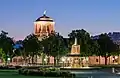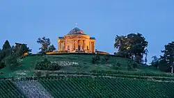 King Frederick I's Württemberg was given high status in the Confederation of the Rhine among the College of Kings, and the lands of nearby secondary German states.[63] Within Stuttgart, the royal residence was expanded under Frederick although many of Stuttgart's most important buildings, including Wilhelm Palace, Katharina Hospital, the State Gallery, the Villa Berg and the Königsbau were built under the reign of King Wilhelm I.[64] In 1818. King Wilhelm I and Queen Catherine in an attempt to assuage the suffering caused by the Year Without Summer and following famine,[65] introduced the first Cannstatter Volksfest to celebrate the year's bountiful harvest.[25][27] Hohenheim University was founded in 1818,[66] and two years later the Württemberg Mausoleum as completed on the hill where Wirtemberg Castle once stood.