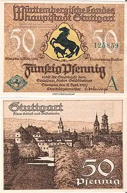 At the end of the First World War, November revolutionaries declared a "social republic" in Stuttgart on 9 November and set up a provisional revolutionary government. A week later King Wilhelm II released all civil servants from their oath of allegiance to him and formally abdicated on 30 November.[80][81] A constituent assembly elected in January 1919 wrote a republican constitution for Württemberg which became effective on 25 September 1919. It established the Free People's State of Württemberg with its capital at Stuttgart as a part of the Weimar Republic.[82] In 1920, Stuttgart temporarily became the seat of the German National Government when the administration fled from Berlin from the Kapp Putsch.[83] Also in 1920, Erwin Rommel became the company commander of the 13th Infantry Regiment based in Stuttgart and would remain as such for the next nine years.[84]