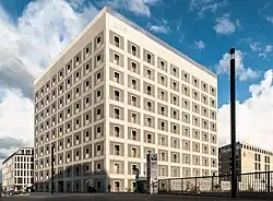 The Hotel Silber (English: Silver), previously occupied by other forms of political police, was occupied by the Gestapo in 1933 to detain and torture political dissidents.[90] The hotel was used for the transit of Nazi prisoners of conscience including Eugen Bolz, Kurt Schumacher, and Lilo Herrmann to concentration camps. The nearby court at Archive Street (German: Archivstraße) 12A was also used as a central location for executions in Southwest Germany, as the headstone located in its atrium dedicated to the 419 lives lost there recalls.[91] Participants of the Kristallnacht burned the Old Synagogue to the ground[92] along with the relics contained within and also destroyed its Jewish cemetery.[93] The next year the Nazi regime began the arrests and deportation of Stuttgart's Jewish inhabitants, beginning with the entire male Jewish population of Stuttgart, to the police-run prison camp at Welzheim or directly to Dachau.[94] Other Jews from around Württemberg were brought to Stuttgart and housed in the ghetto on the former Trade Fair grounds in Killesberg. As the Memorial at Stuttgart North records,[95] between 1941 (the first train arrived 1 December 1941, and took around 1,000 men to Riga) and 1945, more than 2,000 Jews from all over Württemberg[95] were deported to Theresienstadt, Auschwitz, and the ghettos at Riga and Izbica. Of them, only 180 held in Internment survived the Shoah.[96][97]