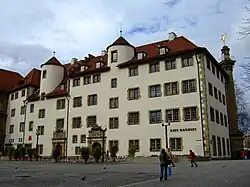 In 1488, Stuttgart officially became the de facto residence of the Count himself as opposed to the location of his home, the Old Castle.[25] Eberhard I, then Count Eberhard V, became the first Duke of Württemberg[d] in 1495,[27] and made Stuttgart the seat of the Duchy of Württemberg in addition to the County thereof. All this would be lost to the Württembergs during the reign of his son, Ulrich. Though Ulrich initially made territorial gains as a result of his decision to fight alongside the Emperor Maximilian I,[40] he was no friend of the powerful Swabian League nor of his own subjects,[40] who launched the Poor Conrad rebellion of 1514.[41][42] Despite this and his rivalry with the Swabian League, his undoing would actually come in the form of his unhappy marriage to Sabina of Bavaria.[43] In 1515, Ulrich killed an imperial knight and lover of Sabina's by the name of Hans von Hutten,[44] obliging her to flee to the court of her brother, William IV, Duke of Bavaria, who successfully had Ulrich placed under Imperial ban twice. When the Emperor died in 1519, Ulrich struck, seizing the Free Imperial City of Reutlingen, prompting the League to intervene. That same year, Ulrich was soundly defeated and he was driven into exile in France and Switzerland following the League's conquest of Württemberg.[40] Württemberg was then sold by the League to Emperor Charles V,[45] who then granted it to his brother, Ferdinand I, thus beginning the 12 year ownership of the county by the Habsburgs.[35] When the peasants Ulrich had crushed before rose once again in the German Peasants' War,[41][42] Stuttgart was occupied by the peasant armies for a few days in the Spring of 1525. Ulrich, with the help of Philip I, Landgrave of Hesse, seized the chance to restore himself to power (albeit as an Austrian vassal)[40] in the turmoil of the Reformation and War with the Turks and invited Erhard Schnepf to bring the Reformation to Stuttgart. He accepted, was named Court Preacher in Stuttgart, and worked in concert with Ambrosius Blarer until his dismissal following his resistance to the Augsburg Interim by the Duke in 1548.[46] Duke Ulrich himself died two years later, and was succeeded by his son, Christoph. He had grown up in a Württemberg in turmoil and wished to rebuild its image. To this end, he once again began a construction boom all over the Duchy under the direction of Court Architect Aberlin Tretsch;[47] knowing full well that the time of the Reisekönigtum was over, Christoph and Tretsch rebuilt and remodeled the Old Castle into a Renaissance palace,[39] and from 1542 to 1544, what is today the Schillerplatz was built as a town square.[27] Duke Christoph also responded to the increasing need for drinking water by embarking upon a massive hydraulic engineering project in the form of a 2,810 ft (860 m) tunnel to Pffaf Lake, the Glems, and the Nesenbach from 1566 to 1575. In 1575, Georg Beer was also appointed Court Architect, and he built the Lusthaus. But it was architect Heinrich Schickhardt who would carry Tretsch's torch further; Schickhardt constructed the Stammheim Castle in the suburb of Stammheim, rebuilt the Fruchtkasten in the today's Schillerplatz,[48] and expanded the Prinzebau.[49]