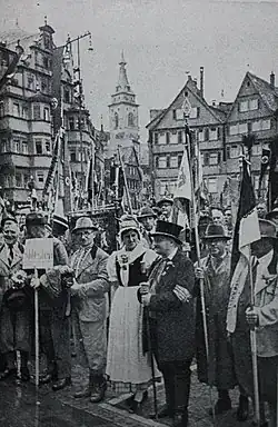 Due to the Nazi Party's practice of Gleichschaltung, Stuttgart's political importance as state capital became totally nonexistent, though it remained the cultural and economic centre of the central Neckar region. Stuttgart, one of the cities bestowed an honorary title by the Nazi regime, was given the moniker "City of the Abroad Germans" in 1936.[85][86][87] The first prototypes of the Volkswagen Beetle were manufactured in Stuttgart, according to designs by Ferdinand Porsche, by a design team including Erwin Komenda and Karl Rabe.[88][89]