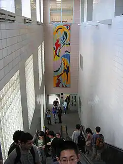 Stuyvesant's principal at the time, Abraham Baumel, visited the country's most advanced laboratories to gather ideas about what to include in the new Stuyvesant building's 12 laboratory rooms. The new 10-story building also included banks of escalators, glass-walled studios on the roof, and a shorter four-story northern wing with a swimming pool, five gymnasiums, and an auditorium.[43] Construction began in 1989. When it finally opened five years later in 1992, the building was New York City's first new high school building in ten years. The new downtown Stuyvesant Campus cost $150 million, making it the most expensive high school building ever built in the city at the time.[17] The S.H.S. Library has a capacity of 40,000 volumes and overlooks Battery Park City.[45]