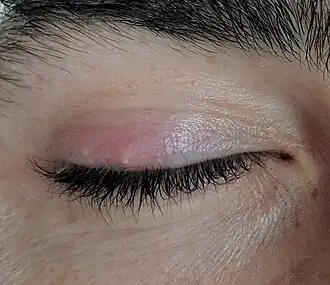 A stye, also known as a hordeolum, is a bacterial infection of an oil gland in the eyelid.[4] This results in a red tender bump at the edge of the eyelid.[1][5] The outside or the inside of the eyelid can be affected.[3]