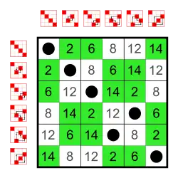 and whose group operation is addition modulo 8. Its Cayley table is