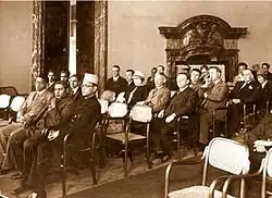 Janakinath Bose, Prabhabati Bose, and their family, ca. 1905. Sarat Chandra Bose (standing, centre) and Subhas Bose (aged 8, standing, extreme right).[68]