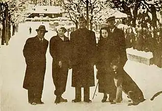 (left) Bose with Emilie Schenkl, in Bad Gastein, Austria, 1936; (right) Bose, INC president-elect, centre, in Bad Gastein, Austria, December 1937, with (left to right) A. C. N. Nambiar (Bose's second-in-command, Berlin, 1941–1945), Heidi Fulop-Miller, Schenkl, and Amiya Bose.