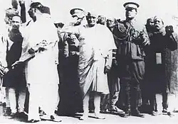 Subhas Bose (in military uniform) with Congress president, Motilal Nehru taking the salute. Annual meeting, Indian National Congress, 29 December 1928