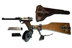 Stocked pistols were common at the beginning of the 20th century, the Germans initially using heavier versions of the P08 pistol equipped with a detachable stock, larger-capacity snail-drum magazine and a longer barrel.