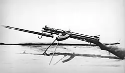 In 1895, Hiram Maxim produced the 'miniature Maxim' which was a pistol-calibre Maxim machinegun weighing 27 lb (12.2 kg) that was sold in small quantities to various countries and tested by the US military but not adopted.[7] In 1896, a select-fire pistol was patented by the British inventor Hugh Gabbett-Fairfax.[8]