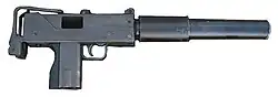 An Ingram MAC-10 with a suppressor, magazine detached