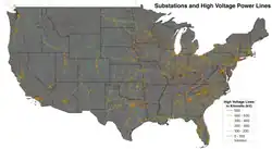 A substation is a part of an electrical generation, transmission, and distribution system. Substations transform voltage from high to low, or the reverse, or perform any of several other important functions. Between the generating station and the consumer, electric power may flow through several substations at different voltage levels. A substation may include transformers to change voltage levels between high transmission voltages and lower distribution voltages, or at the interconnection of two different transmission voltages. They are a common component of the infrastructure. There are 55,000 substations in the United States.[2] Substations are also occasionally known in some countries as switchyards.