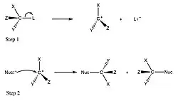 The SN1 mechanism has two steps. In the first step, the leaving group departs, forming a carbocation (C+). In the second step, the nucleophilic reagent (Nuc:) attaches to the carbocation and forms a covalent sigma bond. If the substrate has a chiral carbon, this mechanism can result in either inversion of the stereochemistry or retention of configuration. Usually, both occur without preference. The result is racemization.