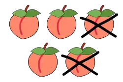 Subtraction (which is signified by the minus sign, –) is one of the four arithmetic operations along with addition, multiplication and division. Subtraction is an operation that represents removal of objects from a collection.[1] For example, in the adjacent picture, there are 5 − 2 peaches—meaning 5 peaches with 2 taken away, resulting in a total of 3 peaches. Therefore, the difference of 5 and 2 is 3; that is, 5 − 2 = 3. While primarily associated with natural numbers in arithmetic, subtraction can also represent removing or decreasing physical and abstract quantities using different kinds of objects including negative numbers, fractions, irrational numbers, vectors, decimals, functions, and matrices.[2]