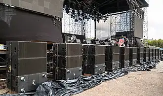 Professional audio subwoofers used in rock concerts in stadia, DJ performances at dance music venues (e.g., electronic dance music) and similar events must be capable of very high bass output levels, at very low frequencies, with low distortion. This is reflected in the design attention given in the 2010s to the subwoofer applications for sound reinforcement, public address systems, dance club systems and concert systems. Cerwin-Vega states that when a subwoofer cabinet is added to an existing full-range speaker system, this is advantageous, as it moves the "...lowest frequencies from your main [full-range] PA speakers" thus "...eliminat[ing] a large amount of the excess work that your main top [full-range] box was trying to reproduce. As a result, your main [full-range] cabinets will run more efficiently and at higher volumes."[95] A different argument for adding subwoofer cabinets is that they may increase the "level of clarity" and "perceived loudness" of an overall PA system, even if the SPL is not actually increased.[96] Sound on Sound states that adding a subwoofer enclosure to a full-range system will reduce "cone excursion", thus lowering distortion, leading to an overall cleaner sound.[97]