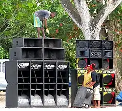 In sound system culture, there are both "low and high bass bins" in "towering piles" that are "delivered in large trucks" and set up by a crew of "box boys", and then positioned and adjusted by the sound engineer in a process known as "stringing up", all to create the "sound of reggae music you can literally feel as it comes off these big speakers".[26] Sound system crews hold 'sound clash' competitions, where each sound system is set up and then the two crews try to outdo each other,[27] both in terms of loudness and the "bass it produced".[28]
