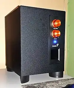 While the term "subwoofer" technically only refers to the speaker driver, in common parlance, the term often refers to a subwoofer driver mounted in a speaker enclosure (cabinet), often with a built-in amplifier.
