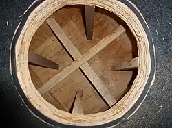 During the 1940s swing era, to get deeper bass, "pipelike opening[s]" were cut into speaker enclosures, creating bass reflex enclosures, as it was found that even a fairly inexpensive speaker enclosure, once modified in this way, could "transmit the driving power of a heavy...drumbeat—and sometimes not much else—to a crowded dancefloor."[9] Prior to the development of the first subwoofers, woofers were used to reproduce bass frequencies, usually with a crossover point set at 200 Hz and a 4-inch (10 cm) loudspeaker in an infinite baffle or in professional sound applications, a "hybrid horn-loaded" bass reflex enclosure (such as the 15-inch Altec Lansing A-7 enclosure nicknamed the "Voice of the Theater", which was introduced in 1946).[11] In the mid-1950s, the Academy of Motion Picture Arts and Sciences selected the "big, boxy" Altec A-7 as the industry standard for movie sound reproduction in theaters.[12]