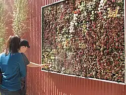 A succulent wall in a nursery in San Francisco, United States consisting of Sempervivum, Echeveria, and Crassula
