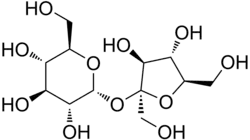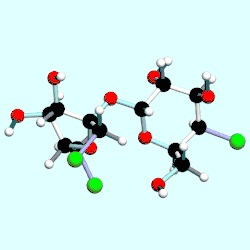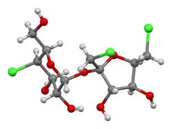 Sucralose is a disaccharide composed of 1,6-dichloro-1,6-dideoxyfructose and 4-chloro-4-deoxygalactose. It is synthesized by the selective chlorination of sucrose in a multistep route that substitutes three specific hydroxyl groups with chlorine atoms. This chlorination is achieved by selective protection of one of the primary alcohols as an ester (acetate or benzoate), followed by chlorination with an excess of any of several chlorinating agent to replace the two remaining primary alcohols and one of the secondary alcohols, and then by hydrolysis of the ester.[31][32]