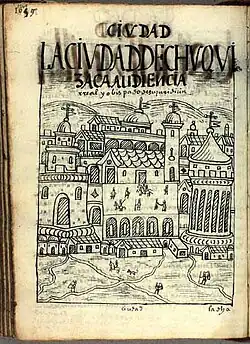Chuquisaca -as was its colonial name- in 1615 by the Inca painter Guamán Poma in his work "Nueva corónica y buen gobierno". Royal Library, Denmark.[13]