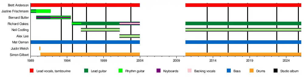 By spring 1991, Anderson and Frischmann had broken up. Frischmann began dating Blur frontman Damon Albarn. She believed the band could adapt to the new situation.[15] However, tensions grew. Butler recalled, "She'd turn up late for rehearsals and say the worst thing in the world – 'I've been on a Blur video shoot.' That was when it ended, really. I think it was the day after she said that Brett phoned me up and said, 'I've kicked her out.'" After Frischmann's departure, the character of the group shifted. "If Justine hadn't left the band," Anderson remarked, "I don't think we'd have got anywhere. It was a combination of being personally motivated and the chemistry being right once she'd left." Anderson and Butler became close friends and started writing several new songs together.[16] Still, the band's music remained out of step with the prevailing sounds of London's music scene and the American grunge movement. Anderson noted, "For the whole of 1991, A&R men wouldn't give us a second look."[17]