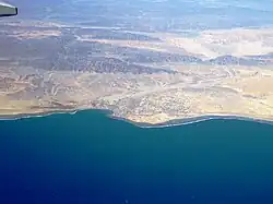 ![]() Satellite view of the port and city, the southern terminus of the Suez Canal that transits through Egypt and debouches into the Mediterranean Sea near Port Said. (Up is north-east). | |