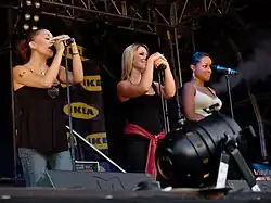 ![]() From left to right: Buena, Donaghy and Buchanan performing at Manchester Pride in 2013 | |