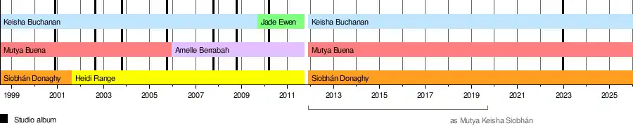 In 2009, after 11 years in Sugababes, Buchanan, the final original member, was replaced by Jade Ewen. Sugababes released Sweet 7 (2010), after which they signed to RCA Records, before taking an indefinite hiatus in 2011 following the release of their single "Freedom". That year, the original lineup re-formed as Mutya Keisha Siobhán and released the single "Flatline" in 2013. The trio regained the name Sugababes in 2019, and in 2021, they rereleased One Touch for its 20th anniversary. In 2022, they released The Lost Tapes, an album of previously unreleased leaked material. In 2025, the group independently released the singles "Jungle", "Weeds" and "Shook",[2] and embarked on the Sugababes '25 Tour, their first arena tour.