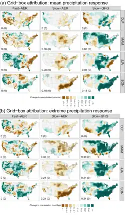 In the United States, aerosols generally reduce both mean and extreme precipitation across all four seasons, which has cancelled out the increases caused by greenhouse gas warming[46]
