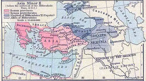 During the close of the Social War, in 89 BC, Mithridates VI Eupator of Pontus invaded Roman Asia.[97] In the summer of 88, he reorganised the administration of the area before unsuccessfully besieging Rhodes.[98] News of these conquests reached Rome in the autumn of 89 BC, leading the Senate and people to declare war; actual preparations for war were, however, delayed: after Sulla was given the command, it took him some eighteen months to organise five legions before setting off; Rome was also severely strained financially.[99] While Rome was preparing to move against Pontus, Mithridates arranged the massacre of some eighty thousand Roman and Italian expatriates and their families – known today as the Asiatic vespers – and confiscated their properties.[100]