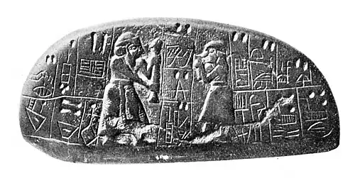 The Blau Monuments combine proto-cuneiform characters and illustrations of early Sumerians, Jemdet Nasr period, 3100–2700 BC. British Museum.