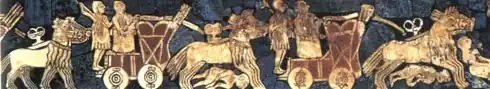 Enthroned Sumerian king of Ur, possibly Ur-Pabilsag, with attendants. Standard of Ur, c. 2600 BC.