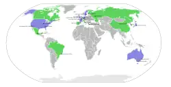 Map of Summer Olympic Games locations – countries that have hosted one Summer Olympics are shaded green, while countries that have hosted two or more are shaded blue.