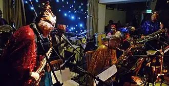In September 2008 they played for 7 days in a row at the ZXZW festival, each day emphasizing different aspects of the musical legacy of Sun Ra. In 2009, they performed at Philadelphia's Institute of Contemporary Art in conjunction with an exhibition that explored the intersection of the Arkestra's performing legacy and the practice of contemporary art.[44] In 2011, they ventured to Australia for the first time, for the 2011 Melbourne International Jazz Festival and MONA (Museum of Old and New Art) in Tasmania. In 2017, the Arkestra performed at the 31st Lowell Folk Festival in Lowell Massachusetts.[45] In 2019, it was announced that the Arkestra would perform at Portland, Oregon's Hollywood Theater for three nights on July 14, 15 and 16.[46] On October 22, 2021, they performed at the BRIC JazzFest in Downtown Brooklyn.[47]