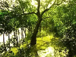 The Sundarbans freshwater swamp forests are a tropical moist broadleaf forest ecoregion of Bangladesh and India. It represents the brackish swamp forests that lie behind the Sundarbans Mangroves, where the salinity is more pronounced. The freshwater ecoregion is an area where the water is only slightly brackish and becomes quite fresh during the rainy season, when the freshwater plumes from the Ganges and the Brahmaputra rivers push the intruding salt water out and bring a deposit of silt. It covers 14,600 square kilometres (5,600 sq mi) of the vast Ganges-Brahmaputra Delta, finishing at the mouth of the Bay of Bengal from the northern part of Khulna District and the southern part of North 24 Parganas district in the Indian state of West Bengal. The Sundarbans freshwater swamp forests lie between the upland Lower Gangetic plains moist deciduous forests and the brackish-water Sundarbans mangroves bordering the Bay of Bengal.[26]