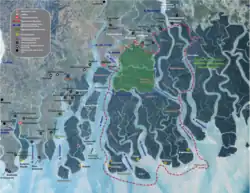 The Sundarban forest lies in the vast delta on the Bay of Bengal formed by the super-confluence of the Hooghly, Padma (both are distributaries of Ganges), Brahmaputra and Meghna rivers across southern Bangladesh. The seasonally flooded Sundarbans freshwater swamp forest lies inland from the mangrove forests on the coastal fringe. The forest covers 10,277 km2 (3,968 mi2) of which about 6,517 km2 (2,516 mi2) are in Bangladesh. The Indian part of Sundarbans is estimated to be about 4,260 km2 (1,640 mi2), of which about 1,700 km2 (660 mi2) is occupied by water bodies in the forms of river, canals and creeks of width varying from a few metres to several kilometres.[18][19][20]