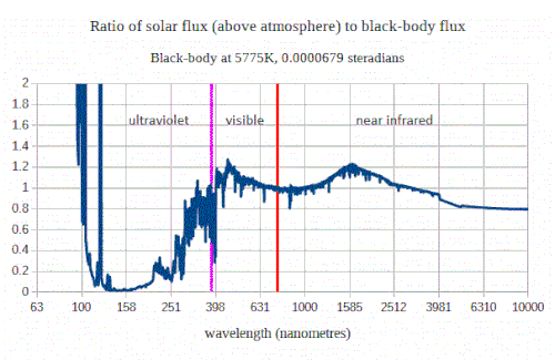 - ^ Calculated from data in "Reference Solar Spectral Irradiance: Air Mass 1.5". National Renewable Energy Laboratory. Archived from the original on September 28, 2013. Retrieved 2009-11-12.