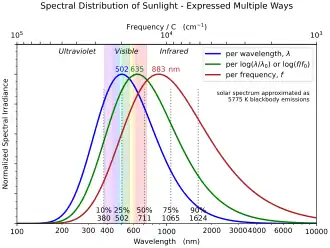 It is sometimes asserted that the Sun's maximum output is in the visible range. However, this statement is a misconception based on only seeing the solar spectral irradiance plotted on a per-wavelength basis. When plotted that way, the power spectral density of sunlight peaks at a wavelength of about 501 nm, which is in the visible range. However, the solar spectral irradiance can with equal validity be calculated on a per-frequency basis, in which case the maximum is at 3.40×1014 Hz, corresponding to a wavelength of about 882 nm, which is in the near infrared (Infrared-A) range. Counterintuitively, it is not meaningful to assert that the solar output is greatest at some precise location in the spectrum.[28]